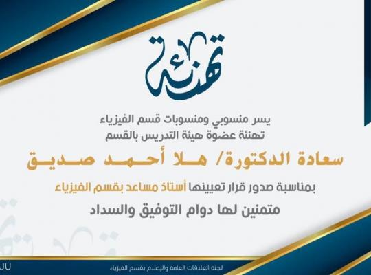 تهنئة الدكتورة هلا صديق بمناسبة تعينها لدرجة استاذ مساعد