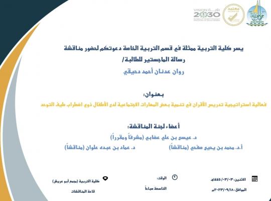 دعوة لحضور مناقشة رسالة الماجستير للطالبة روان دحيقي