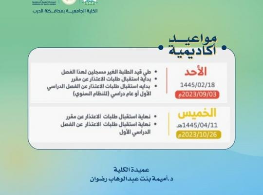 تعلن الكلية الجامعة بمحافظة الدرب عن مواعيد اكاديمية القادمه من 1445/02/18هـ إلى 1445/04/11هـ