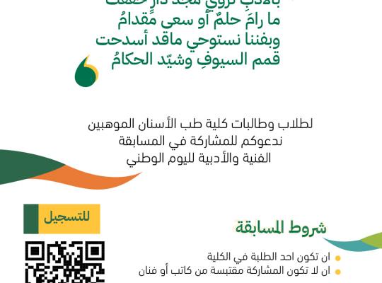 بالأدبِ نروي مجد دارٍ حققت ما رامَ حلمٌ أو سعى مقدامُ وبفننا نستوحي ماقد أسدحت قمم السيوفِ وشيّد الحكامُ لطلاب وطالبات كلية طب الأسنان الموهوبين ندعوكم للمشاركة في المسابقة الفنية والأدبية لليوم الوطني السعودي 🇸🇦٩٣ شروط المسابقة : ١- أن تكون أحد