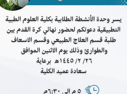 دعوة- حضور نهائي كرة القدم بين طلبة قسم العلاج الطبيعي وقسم الاسعاف والطوارئ.