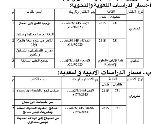 يعلن قسم اللغة العربية وآدابها عن موعد الاختبار الشامل لطلاب مرحلة الدكتوراه وطالباتها ممن اجتازوا مرحلة الدراسة المنهجية، وذلك وفق الاعلان المرفق
