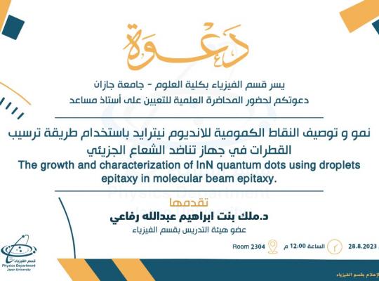محاضرة علمية للدكتورة ملك رفاعي بعنوان "The growth and characterization of InN quantum dots using droplets epitaxy in molecular beam epitaxy. "