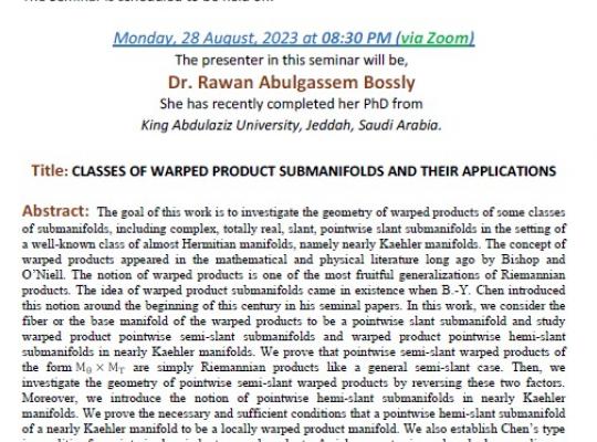 يسر قسم الرياضيات دعوتكم للمشاركة في الندوتين البحثيتين التالييتين . التاريخ: الاثنين 28 أغسطس 2023 م الوقت: 08:30 إلى 09:30 مساءً عبر تطبيق Zoom)) المحاضران: د. روان عبدالقاسم بوصلي والأستاذ علي أحمد مرير. تيتم مشاركة الرابط في وقت لاحق.
