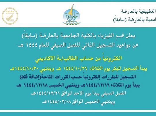 بعلن قسم الفيزياء بالكلية عن مواعيد التسجيل الذاتي للفصل الصيفي للعام 1444هـ