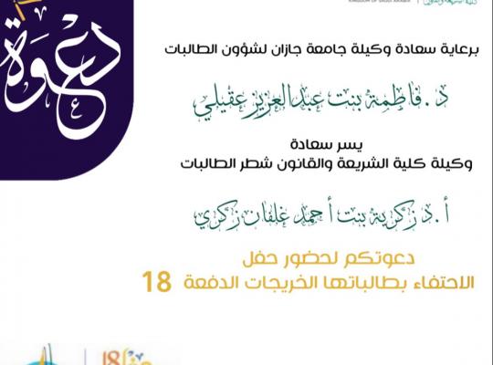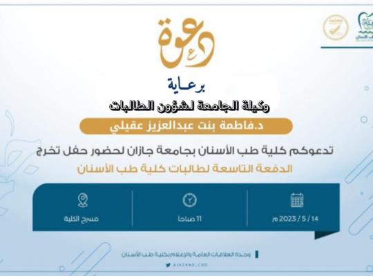 برعاية وكيلة الجامعة لشؤون الطالبات الدكتورة / فاطمة عقيلي . تحتفل كلية طب الأسنان بتخريح الدفعة التاسعة من طالباتها وذلك يوم الأحد الموافق 14 - 5 - 2023م و الذي سيقام في تمام الساعة الحادية عشرة صباحاً بمسرح الكلية ..