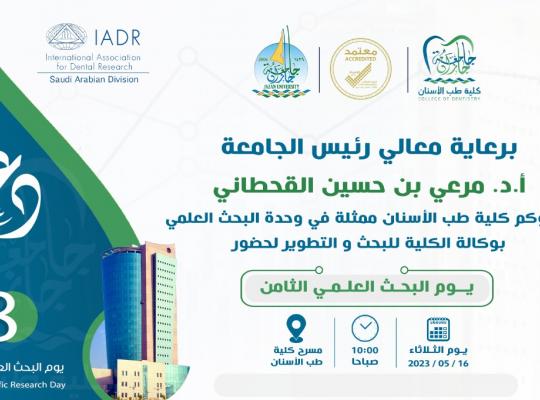تنظم كلية طب الأسنان بجامعة جازان ممثلة بوحدة البحث العلمي بوكالة الكلية للبحث والتطوير يوم الثلاثاء الموافق 16 من شهر مايو ؛ فعاليات يوم البحث العلمي في نسخته الثامنة ، برعاية معالي رئيس الجامعة د. مرعي بن حسين القحطاني . ويأتي تنظيم هذه الفعالية في
