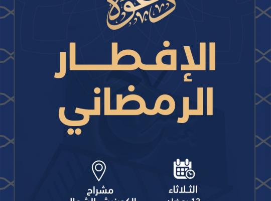 دعوة | يسرنا دعوتكم لحضور الإفطار الرمضاني لمنسوبي الكلية لعام 2023م. 🗒️ الثلاثاء 13 - 9 - 1444 هــ 📍 مشراح بالكورنيش الشمالي فأهلاً ومرحباً بكم 🌹
