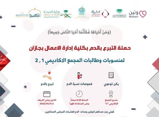 تحت شعار (وَمَنْ أَحْيَاهَا فَكَأَنَّمَا أَحْيَا النَّاسَ جَمِيعًا ۚ ) تعلن كلية إدارة الأعمال بجازان عن حملة التبرع بالدم لمنسوبات وطالبات المجمع الأكاديمي1،2