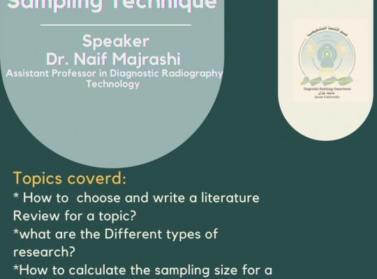 تسر كلية العلوم الطبية التطبيقية متمثلة بقسم تقنية الاشعة التشخيصية لحضور محاضرة بعنوان (Literature Review Research Types and Sampling Technique) يقدمها د/نايف مجرشي. الاربعاء الموافق 1444/06/04هـ الزمن:8:00م تطبيق الزوم.
