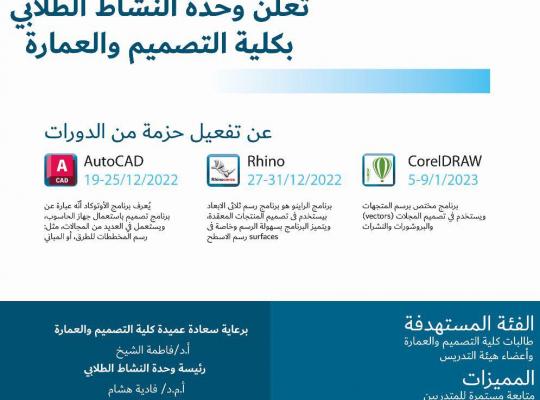 اطلقت وحدة النشاط الطلابي بكلية التصميم والعمارة حزمة من برامج الحاسب الآلي وتم تفعيل اولى هذه الدورات التدريبية ( دورة اساسيات برنامج الاتوكاد ) تقديم م . شريفة أحمد حكمى التي شملت المحاور التالية مقدمة عن برنامج الأوتوكاد والنظام المستخدم فيه ،