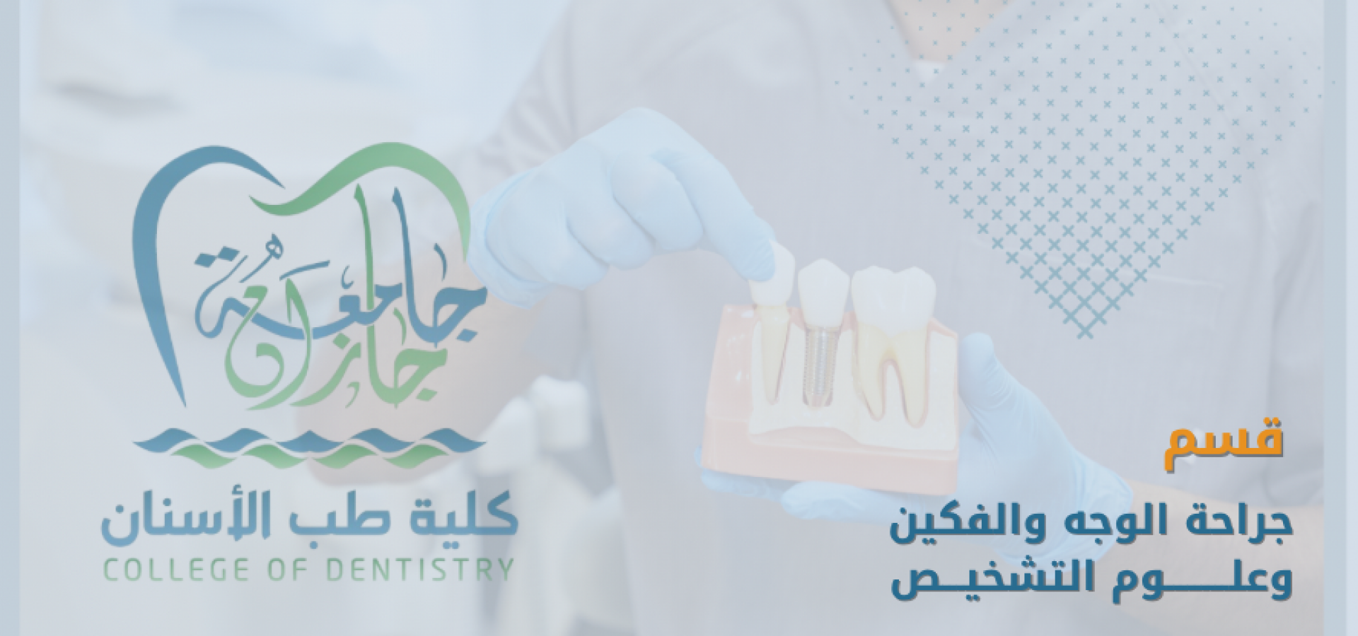 يعتبر قسم جراحه الوجه والفكين وعلوم التشخيص واحد من أقسام كلية طب الاسنان بجامعة جازان ز يضم القسم 26 عضو هيئة تدريس في مختلف التخصصات . يحتوي قسم الجراحه على 3 شعب وهي: