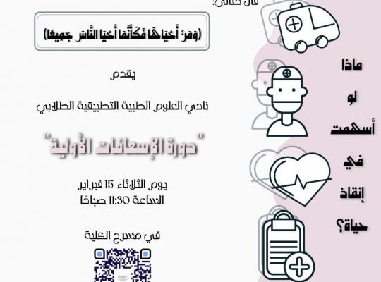اقام قسم الإسعاف والطوارئ بالتعاون مع نادي العلوم الطبية التطبيقية الطلابي فعالية دورة الإسعافات الأولية بمسرح الكلية تحت رعاية سعادة عميد الكلية د. ايمن مدخلي وبحضور سعادة وكيل الكلية للشؤون الاكاديمية د. علي حكمي وسعادة رئيس قسم الإسعاف والطوارئ د