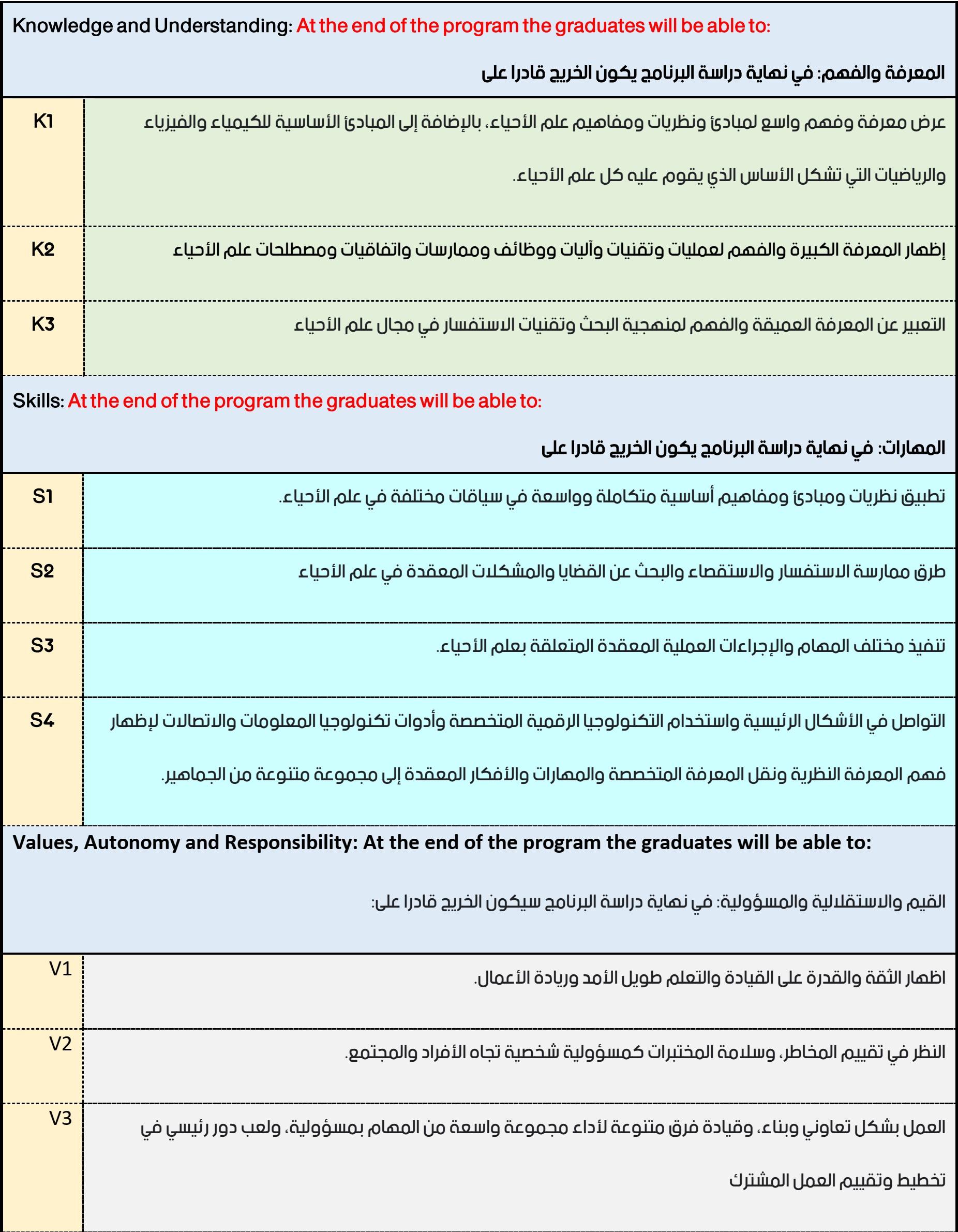 يتم تصنيف مخرجات تعلم برنامج الأحياء إلى مجالات التعلم الثلاثة للإطار الوطني للمؤهلات. يتم التحقق من نتائج التعلم في كل برنامج باستخدام طريقة التقييم المناسبة، ودعم استراتيجيات التدريس التي تتناسب وتتماشى مع أساليب التقييم ونتائج التعلم المقصودة. بعد الانتهاء من برنامج البكالوريوس في علم الأحياء، تتطلب نتائج تعلم البرنامج أن يكون الخريج ملم بمخرجات التعلم التالية.