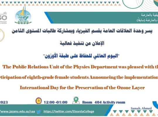 الهدف الرئيسي للنشاط : أهمية طبقة الأوزون وكيفية المحافظة عليها محاور النشاط : ماهي طبقة الأوزون أهمية طبقة الأوزون الاحتباس الحراري أهمية الاحتباس الحراري وصف مختصر للنشاط : نظمت الكلية الجامعية بالعارضة من خلال وحدة العلاقات العامة وبمشاركة طالبات