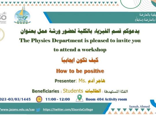 الهدف الرئيسي للنشاط : تحفيز الطالبات وحثهم علي الايجابية محاور النشاط : التفاؤل والرضاء بقضاء الله وقبول الذات وصف مختصر للنشاط : بث الامل والتفاؤل نقاط القوة: تفاعل الطالبات بالفعالية والمشاركة برايهن نقاط الضعف وأولويات التحسين : ضعف حضور الطالبات