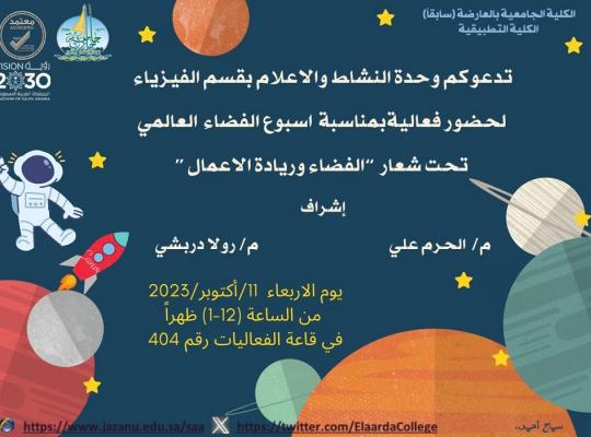 نفذت وحدة النشاط والإعلام لقسم الفيزياء #بالكلية_التطبيقية_بالعارضة_الجامعية (سابقاً) فعالية بمناسبة أسبوع الفضاء العالمي تحت شعار " الفضاء وريادة الأعمال " يوم الاربعاء الموافق 🗒١٤٤٥/٤/٢٦هـ⏰ ١٢ ظهراً📍قاعة الفعاليات بالكلية ٤٠٤
