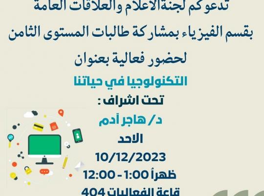 تدعوكم لجنة الاعلام والعلاقات العامة بقسم الفيزياء لحضور فعالية (التكنولوجيا في حياتنا)