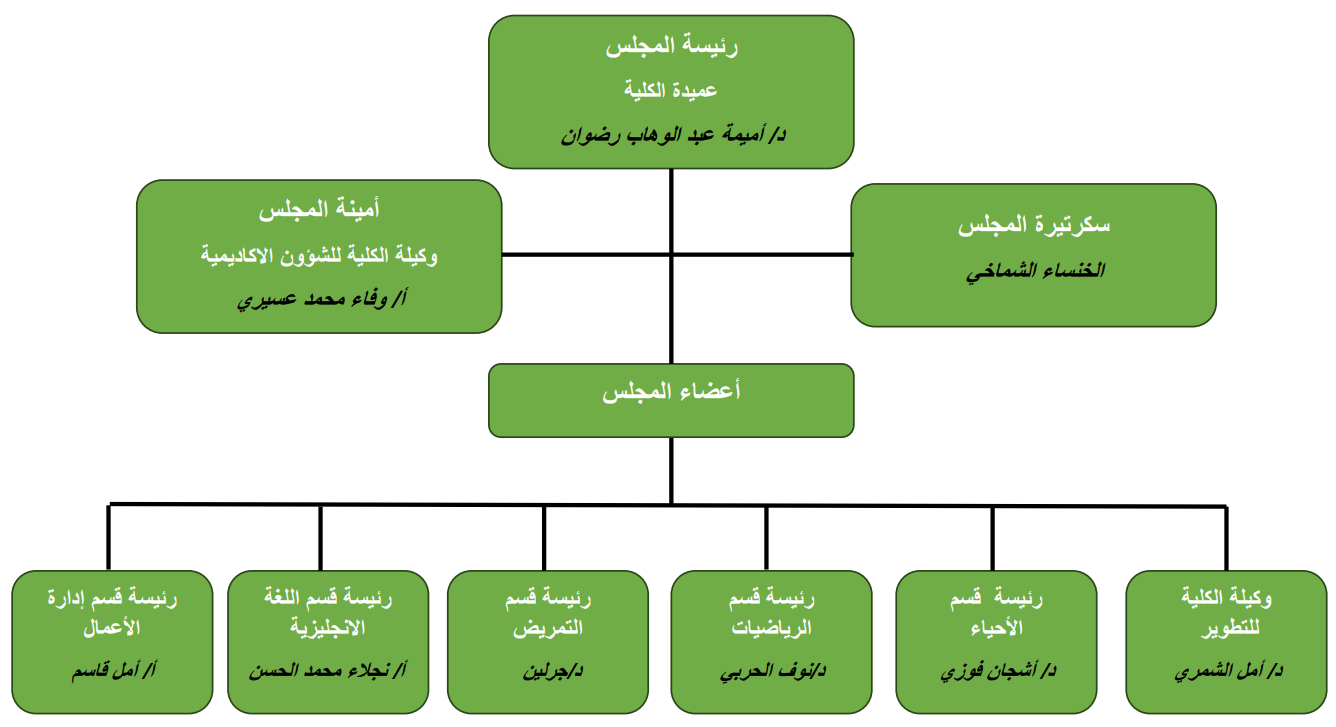 تعتبر أمانة مجلس الكلية هي إدارة تنفيذية تقوم بتسهيل مهام وإجراءات مجلس الكلية، حيث تقدم بعض الأعمال ومنها خدمات الإدارة وأعمال السكرتارية لكل ما يتعلق بأعمال المجلس وبما يتوافق مع نظام المجلس ومع كافة التعليمات التي تصدر من عمادة الكلية. يرتبط أمينة مجلس الكلية ارتباط مباشر بعميدة الكلية الذي يتم تعيينها في هذا المنصب من قبل عميدة الكلية (رئيسة المجلس)