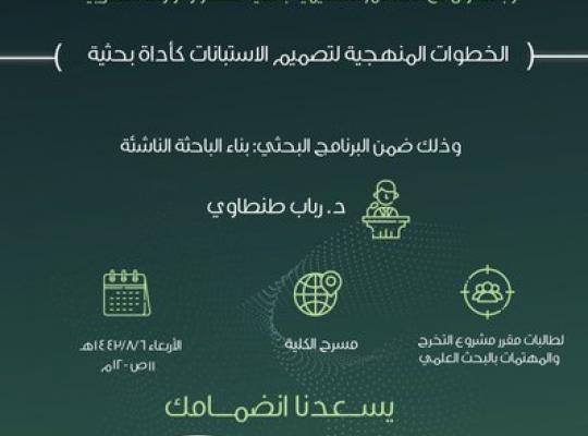 ورشة( الخطوات المنهجية لتصميم الاستبيان كأداة بحثية ) بقسم الاقتصاد المنزلي نفذت الكلية الجامعية بصامطة ممثلة في وكالة البحث والتطوير بالتعاون مع الأقسام الأكاديمية الجامعية بالجامعة ورشة تدريبية بعنوان الخطوات المنهجية لتعميم الاستبيان كأداة بحثية