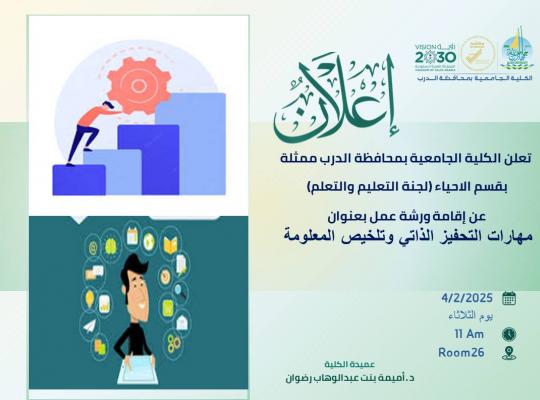 يعلن قسم الاحياء ممثل في لجنة التعليم والتعلم عن اقامة ورشة عمل عن مهارات التحفيز الذاتي وتلخيص المعلومة لطالبات القسم تحت اشراف رئيسة القسم ووحدة التعليم والتعلم