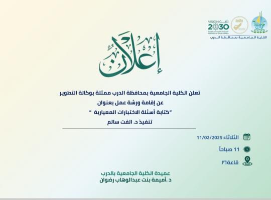 يعلن قسم الاحياء بكلية الدرب الجامعية عن اقامة ورشة عمل بعنوان كيفية كتابة الاختبارات المعيارية