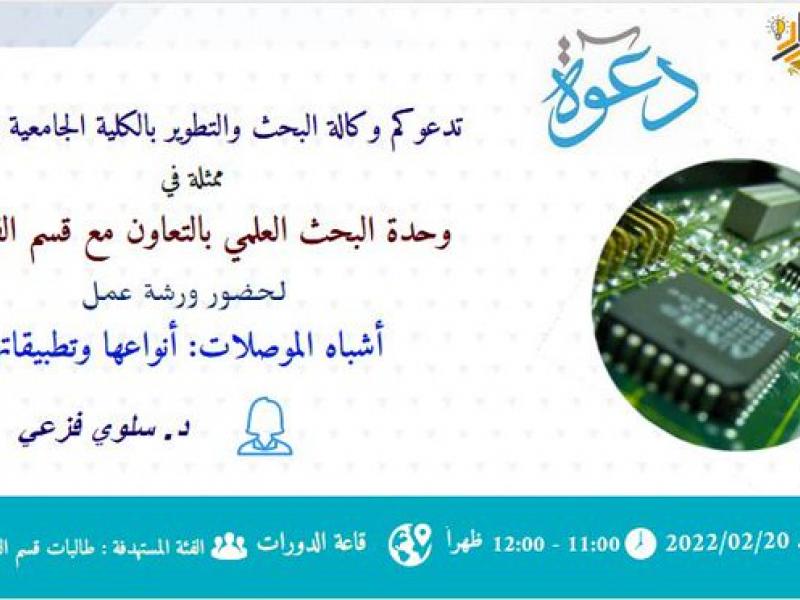 نظمت الكلية الجامعة بصامطة ممثل في وحدة البحث العلمي بالتعاون مع قسم الفيزياء ورشة عمل بعنوان "أشباه الموصلات: أنواعها و تطبيقاتها". نفذتها الدكتورة /سلوى فزعي، واستهدفت طالبات قسم الفيزياء. تطرقت لعدة محاور من أبرزها  التعريف بأصناف المواد في الطبيعة من حيث قدرتها على توصيل الكهرباء (مواد عازلة، مواد موصلة، مواد شبه موصلة). كما تناولت تاريخ أشباه الموصلات وأهميتها. بعد ذلك تم التعريف بمادة السيلكون وذكر استخداماتها و خواصها و مناقشة كيفية تحويلها إلى سيلكون سالب و موجب من خلال إضافة الشوائب.  كما تطرقت إلى ذكر أهم تطبيقات المواد شبه الموصلة مثل استخدامها في الترنزستور و الخلايا الشمسية. بعدها تم ذكرأنواع الخلايا الشمسية و مميزاتها و مجالات استعمالها. وقد شهد هذا اللقاء تفاعل الحضور وتم تقديم عدد من المداخلات والاستفسارات التي أثرت اللقاء.