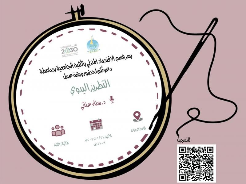 أقامت الكلية الجامعية بصامطة ممثلةً في قسم الاقتصاد المنزلي ورشة عمل بعنوان "التطريز اليدوي"، نفذتها الدكتورة سناء عناني. إذ يُعد التطريز من أعرق فنون زخرفة القماش، والذي كان يستعمل في الحضارات القديمة. و لايزال يُعد هذا الفن من أفضل أنواع تصميم زخرفة الملابس. وقد تطرقت د.سناء لعدة محاور من أبرزها: ماهية التطريز، نشأته وأهم أنواعه، والفرق بين التطريز اليدوي والتطريز الآلي. ثم استعرضت الأدوات المستخدمة في التطريز اليدوي، وأنواع الغرز البسيطة الأساسية، على سبيل المثال: غرزة السراجة، غرزة السلسلة، غرزة الفرع. بعدها تم التطبيق العملي من قبل المتدربات لما تم مناقشته في الجزء النظري من ورشة العمل.