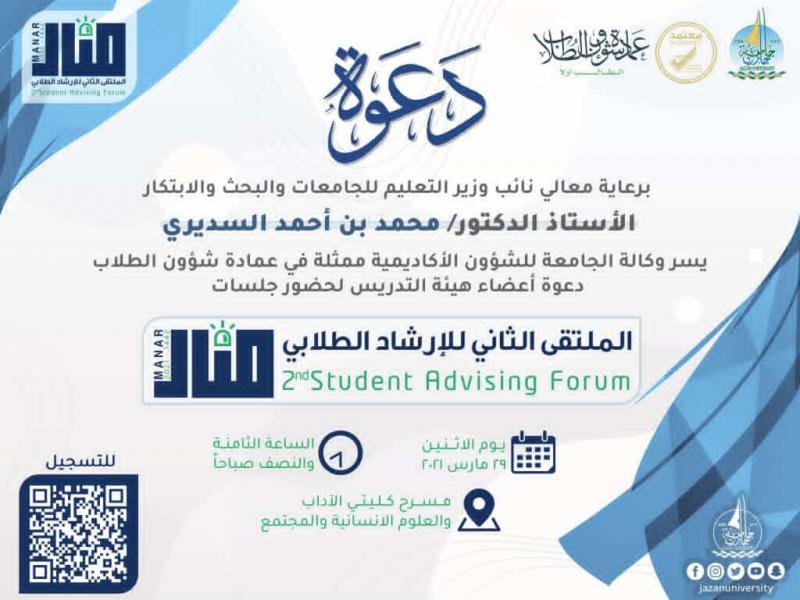 نفذت جامعة جازان ملتقى منار 2 للإرشاد الطلابي على مستوى جامعات المملكة العربية السعودية يوم الإثنين الموافق 29/03/2021 برعاية معالي رئيس الجامعة، حيث أختص الملتقى بعرض أوراق عمل وتجارب ناجحة للإرشاد الطلابي أثناء جائحة كورونا.