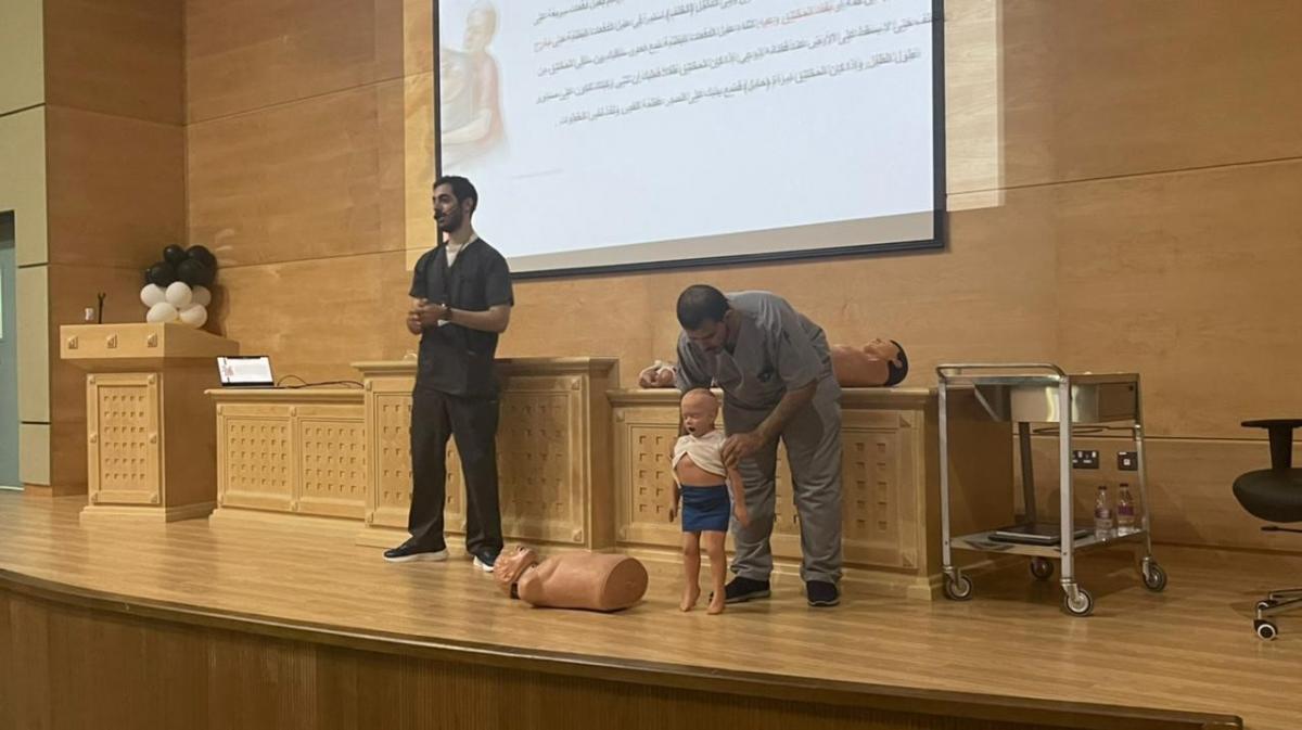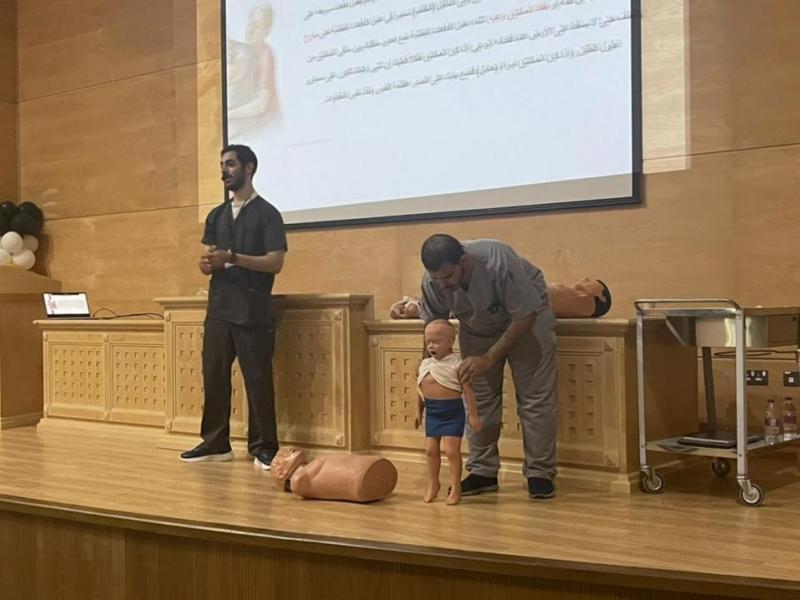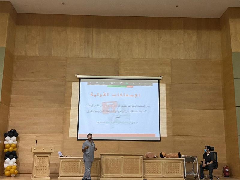 وأعضاء هيئة التدريس من اقسام الكلية المختلفة وعدد كبير من طلاب الكلية وتم استعراض شرائح تقديم توضيحية لبعض الحالات الطارئة مثل الاختناق، النزيف الحاد، وتوقف القلب المفاجئ