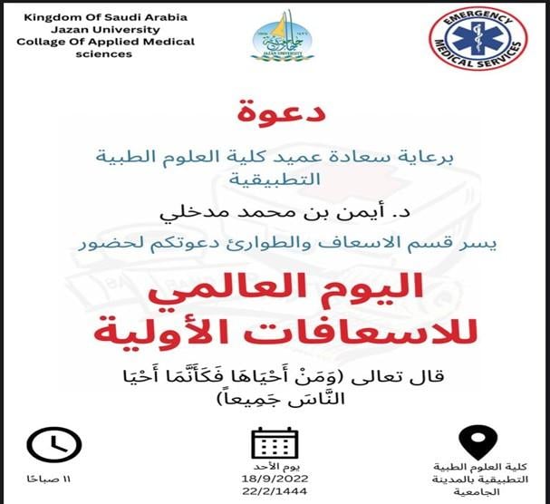 فعلت كلية العلوم الطبية التطبيقية اليوم العالمي للإسعافات الأولية -قسم الإسعاف والطوارىء برعاية سعادة عميد الكلية د. ايمن مدخلي وذلك في بهو الكلية بحضور سعادة وكيل الكلية للشؤون الاكاديمية د. علي حكمي وسعادة رئيس قسم الإسعاف والطوارئ د. نزار خمجان وأعضاء هيئة التدريس من اقسام الكلية المختلفة وعدد كبير من طلاب الكلية