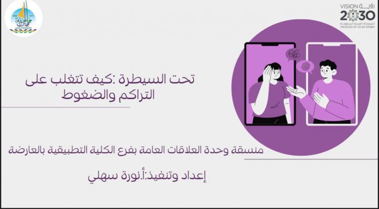 نفذت منسقة وحدة العلاقات العامة بفرع الكلية التطبيقية بالعارضة أ. نورة علي سهلي برنامج (تحت السيطرة: كيف تتغلب على التراكم والضغوط) لمنسوبات وطالبات الكلية بهدف يناء وعي أكبر وطرق إدارتها بشكل إيجابي وذلك ضمن خطة وحدة الإرشاد الأكاديمي التي تهدف إلى معالجة مشكلات الطالبات وتعزيز مهاراتهن في التعامل مع التحديات النفسية.