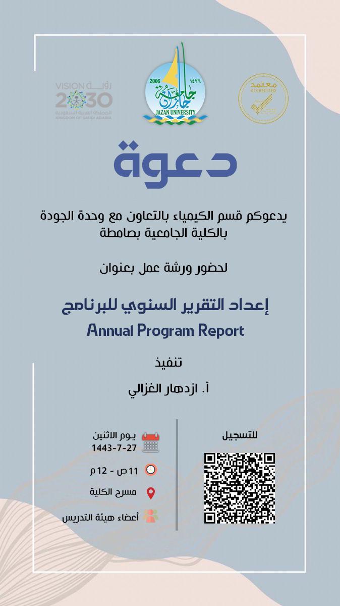 نظم قسم الكيمياء بالتعاون مع وحدة الجودة بالكلية الجامعية بمحافظة صامطة ورشة عمل بعنوان (إعداد التقرير السنوي للبرنامج). قدمتها: د. ازدهار الغزالي واستهدفت أعضاء هيئة التدريس في البرامج المختلفة في الكلية. تم خلالها تقديم نبذة تعريفية عن التقرير السنوي للبرنامج، وكذلك توضيح مفصل لجميع الفقرات الخاصة بالتقرير، والتركيز على البيانات الإحصائية الخاصة بتحليل الدفعات من حيث القبول والانسحاب ومعدلات التخرج، وكيفية إعداد التحليل لهذه الدفعات. كما تم شرح الأدلة والشواهد المطلوبة بكل فقرة من فقرات التقرير وتوضيح كيفية توثيق الأدلة والشواهد. وتم عرض نموذج لتقرير سنوي لبرنامج قسم الكيمياء لعام 2021 ومناقشته مع الحضور. وفي نهاية الورشة تم استقبال استفسارات الحضور ومناقشتها.