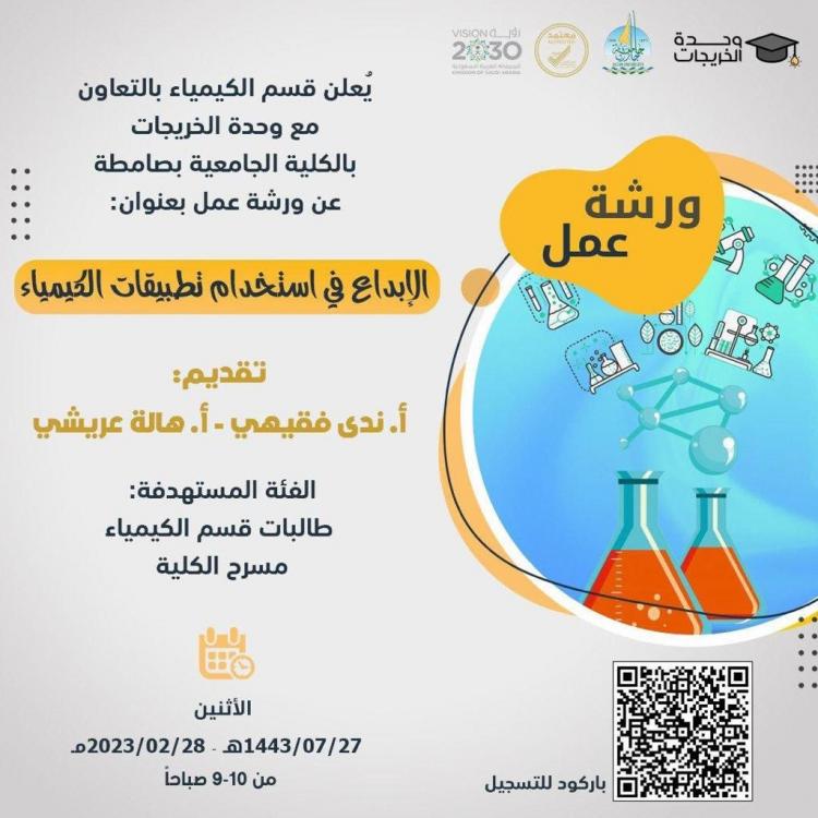 نظم قسم الكيمياء بالتعاون مع وحدة الخريجات بالكلية الجامعية بمحافظة صامطة ورشة عمل بعنوان (الإبداع في استخدام تطبيقات الكيمياء) نفذتها أ.هالة عريشي و أ.ندى فقيهي، واستهدفت طالبات قسم الكيمياء. في بداية الورشة تم تهيئة وجذب الطالبات من خلال توزيع رموز استجابة سريعة (Qr codes) تحمل ألعاب ومسابقات وبعض الكتيبات الكيميائية ومعلومات إثرائية عن الكيمياء. بعد ذلك تم تعريف الطالبات بمجالات الكيمياء وتطبيقاتها وتعريفهم ببعض جهات التوظيف بعد التخرج في كل مجال. كما تم شرح تطبيقين للجوال يساعدان على تعلم الكيمياء بسهولة وعرض بعض مقاطع الفيديو لها وهما CHEMIST-Virtual chem Lab و KingDraw chemical وفي نهاية الورشة تم طرح الأسئلة من المتدربات والاجابة عليها وتم حث المتدربات على اكتساب الخبرات وتنمية المهارات العلمية والتقنية في مجال الكيمياء.