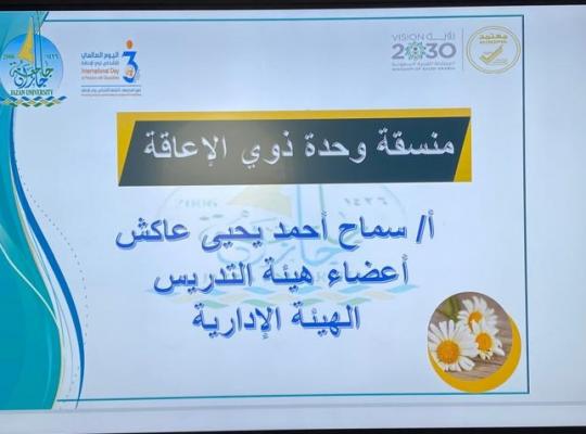 فعلت كلية الشريعة والقانون ممثلة بوحدة خدمة المجتمع فعاليات اليوم العالمي لذوي الإعاقة الذي يصادف الثالث من ديسمبر من كل عام، وذلك بالشراكة مع الكلية التطبيقية بمحافظة صامطة، ضمن جهودها المجتمعية في نشر الوعي وتعزيز ثقافة الدمج والتمكين. وتضمّنت