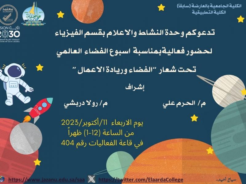 نفذت وحدة النشاط والإعلام لقسم الفيزياء #بالكلية_التطبيقية_بالعارضة_الجامعية (سابقاً) فعالية بمناسبة أسبوع الفضاء العالمي تحت شعار " الفضاء وريادة الأعمال " يوم الاربعاء الموافق 🗒١٤٤٥/٤/٢٦هـ⏰ ١٢ ظهراً📍قاعة الفعاليات بالكلية ٤٠٤
