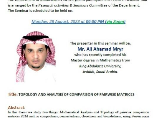 The Department of Mathematics invites you to participate in the upcoming two research seminars. Date: 28 August 2023 (Monday) Time: 08:30 to 09:30 PM (Via Zoom) Presenters: Dr. Rawan Bossly and Mr. Ali Mryr. Zoom link will be shared later. Please