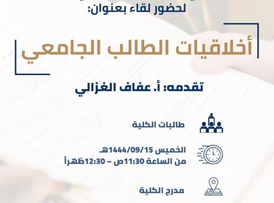 A meeting entitled "University Student Ethics" at the Applied College in Samtah and the University College in Samtah (formerly)