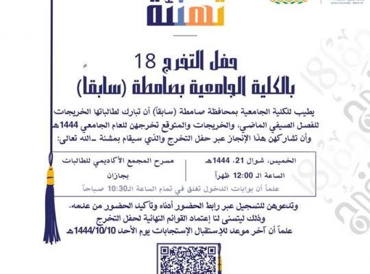 تهنئة الطالبات الخريجات للفصل last summer and female graduates who are expected to graduate for the current academic year (1444 AH) at University College in Samtah (formerly)