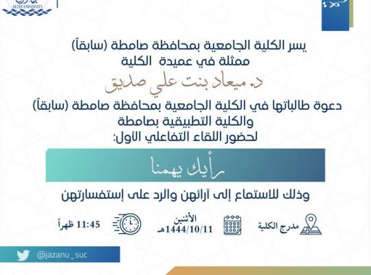 The Applied College in Samtah and the University College in Samtah (formerly) are pleased to invite you to attend the first interactive meeting entitled "Your opinion matters to us"