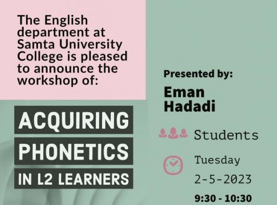A workshop entitled "Acquiring phonetics in L2 learners" at the Applied College in Samtah and the University College in Samtah (formerly)