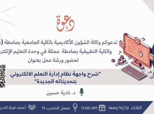 The Applied College in Samtah and the University College in Samtah (formerly) are honored to invite you to attend a workshop entitled "Explanation of the interface of the e-learning management system with its new updates"