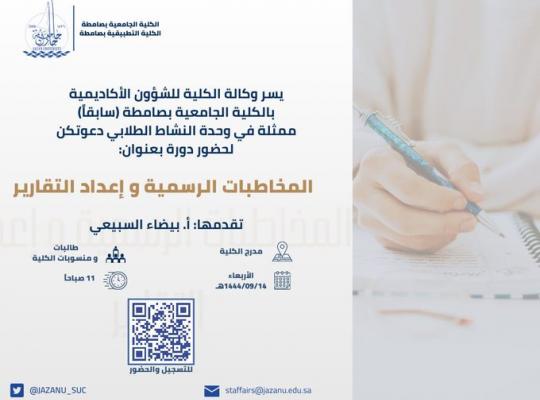 The Applied College in Samtah and the University College in Samtah (formerly) have the honor to invite you to attend a course entitled "Official Correspondence and Report Preparation".