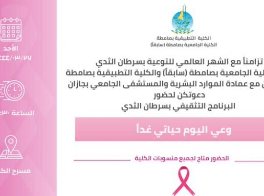 On the occasion of the International Breast Cancer Month, the SUC (formerly) and the Applied College of Samtah have the honor to invite you to attend the educational awareness program about breast cancer, its symptoms and ways to prevent it