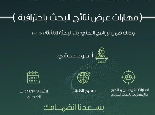 Samtah Applied College and Samtah University College (formerly) are pleased to invite you to attend a training workshop entitled "Skills for Presenting Research Results Professionally", which falls within the "Building the Emerging Researcher" program