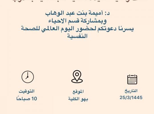 Under the patronage of the Dean of the University College in Darb, Dr. Omaima Radwan, and with the participation of the Biology Department, we are pleased to invite you to attend World Mental Health Day