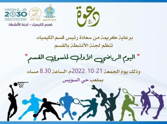 Under the generous patronage of the Head of the Chemistry Department, the activities committee organizes the “first sports day for the department’s employees” on Friday 10/21/2022 , at 8.30 pm, at the Suez District Stadium