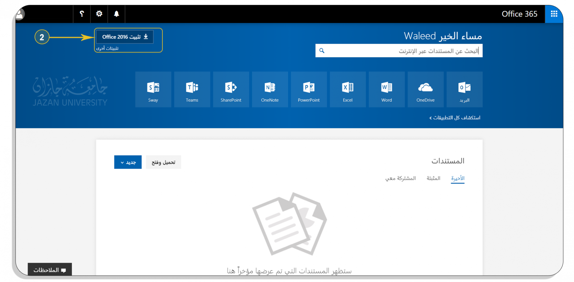الخطوة الرابعة: بعد إتمام عملية الدخول تستطيع من الصفحة التالية تنزيل Office 365 وذلك من خلال الضغط على الأيقونة الموضحة في الصورة أدناه :