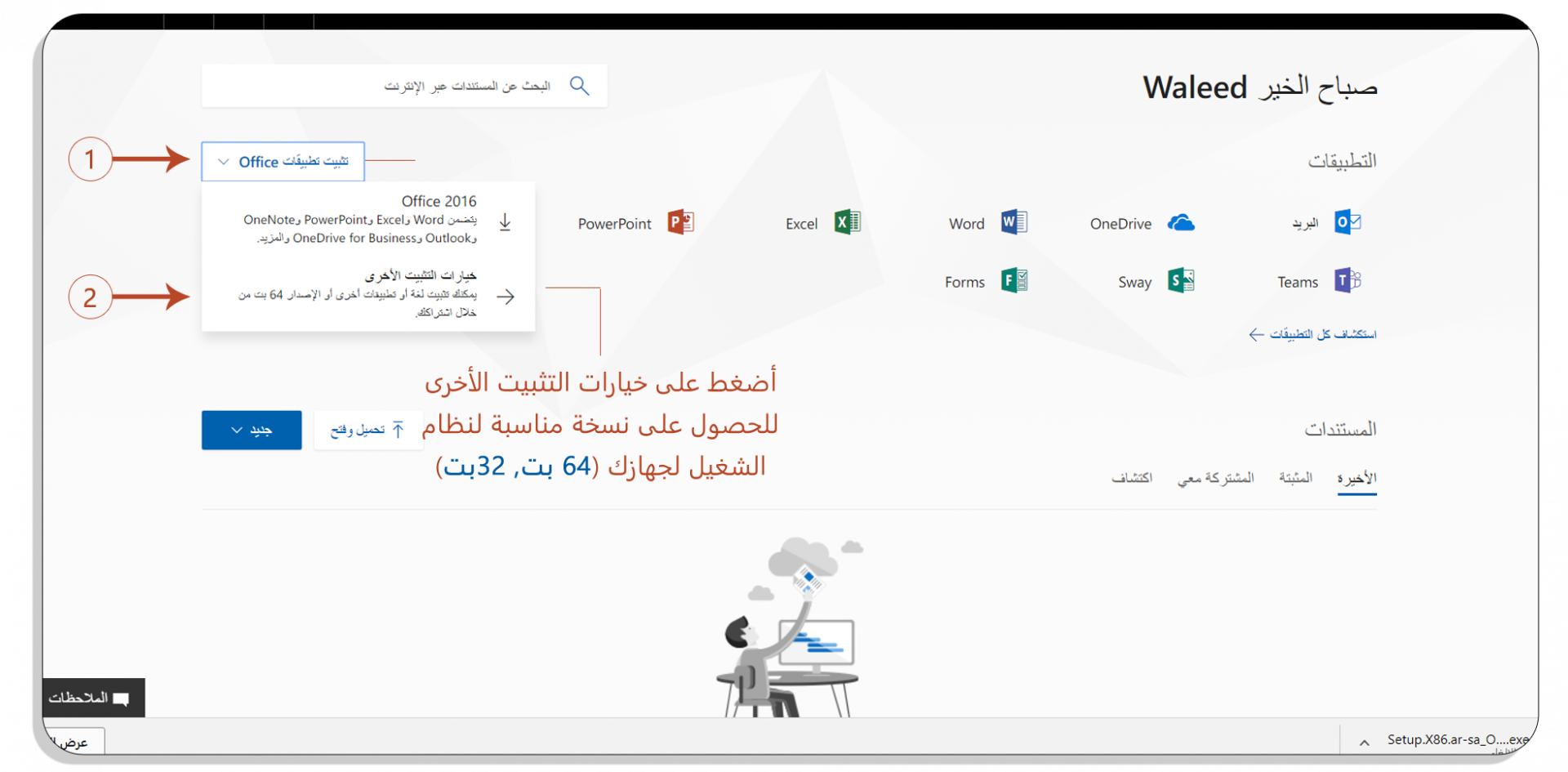 وللحصول على نسخة Office 365 مناسبة لنظام التشغيل لجهازك (64 بت, 32بت) أتبع الخطوات التالية :