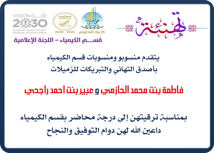 The staff of Chemistry Department extend their sincere congratulations and blessings to Fatima bint Muhammad Al-Hazmi and Abeer bint Ahmed Rajhi on the occasion of their promotion to the rank of lecturer at Chemistry Department, praying to God for their continued success and success.